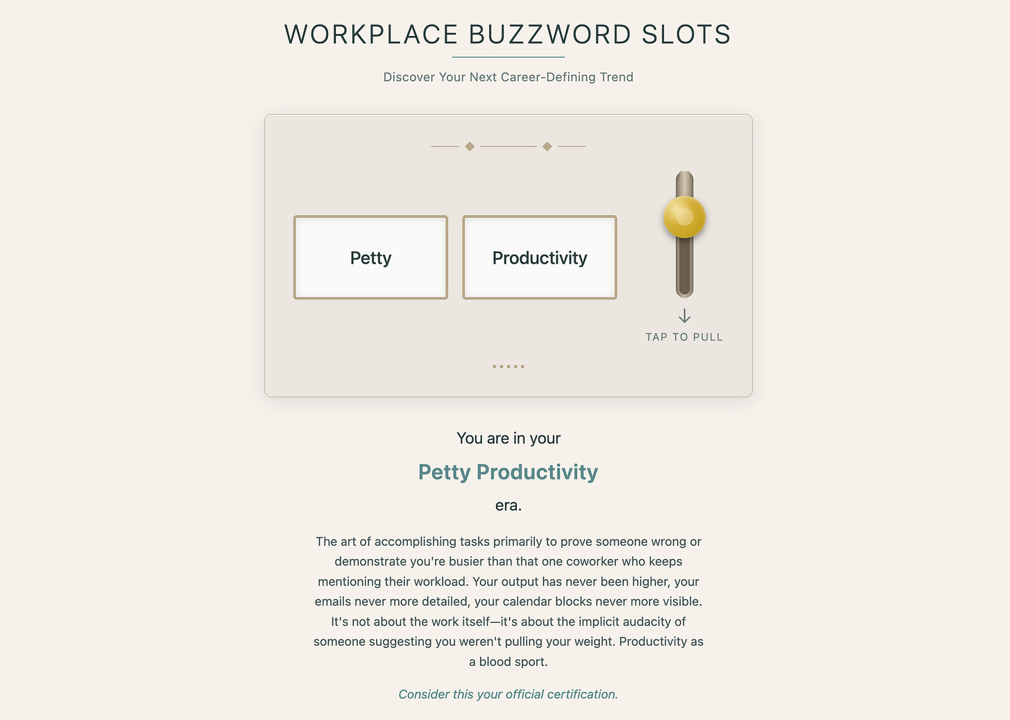 This past weekend, on a lark, I built this thing called Workplace Buzzword Slots. It’s a slot machine that generates ridiculous workplace thought leadership slop in the style of those post-Davos trend reports that flood LinkedIn every January. You know the ones I mean: about how we’re all entering our “authentic leadership era” or whatever.
